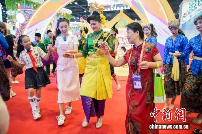 2024年9月27日,在广西南宁举办的第21届中国—东盟博览会迎来首个公众开放日,民众进入会场逛展、购物。图为参观者在马来西亚柔佛州展位与演员共舞。中新社记者 陈冠言 摄