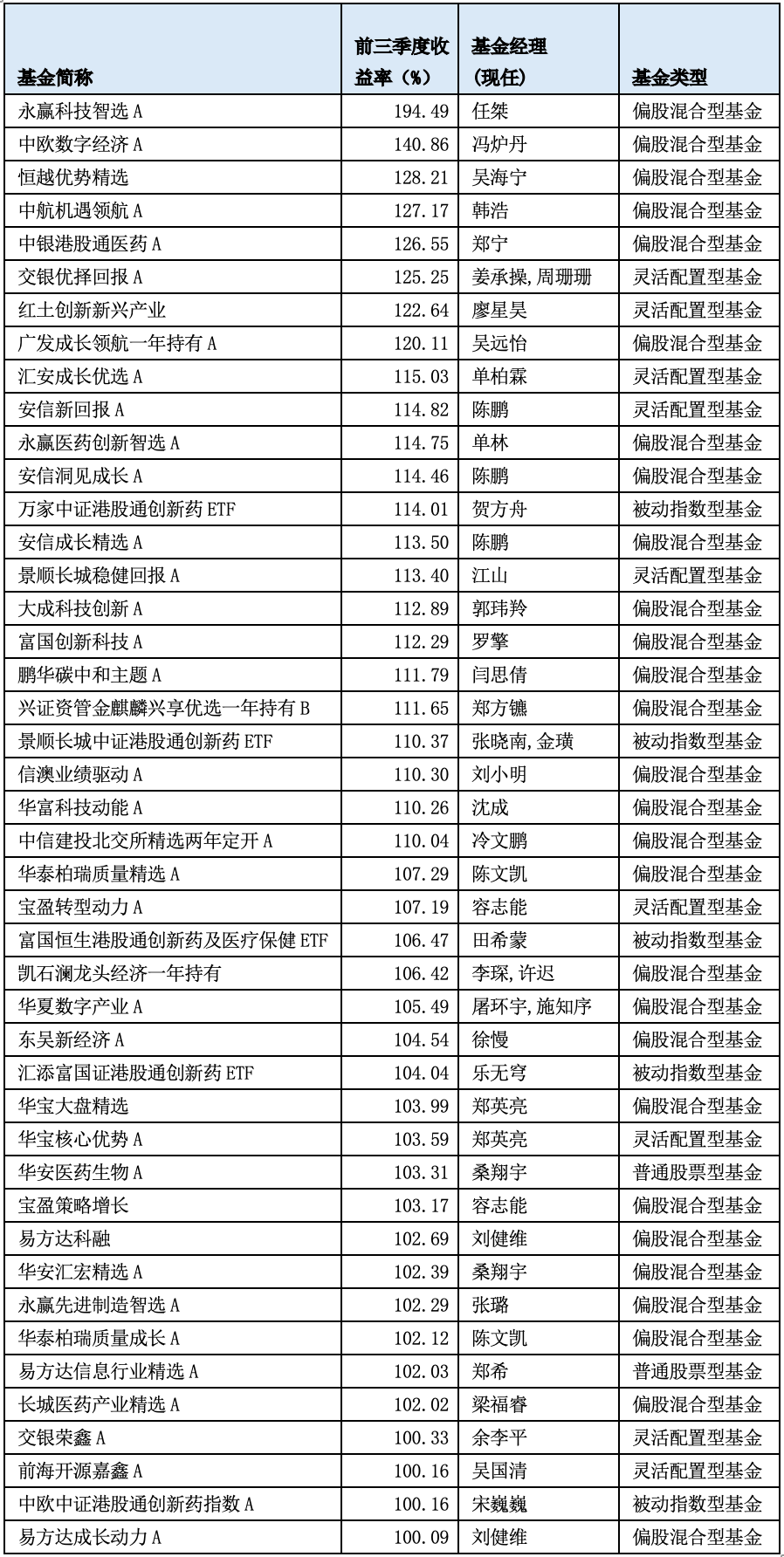 从公司维度来看,44只前三季度业绩翻倍的权益类基金来自30家基金管理机构。永赢基金、易方达基金、安信基金各占3席,是翻倍基金数量最多的3家机构。
