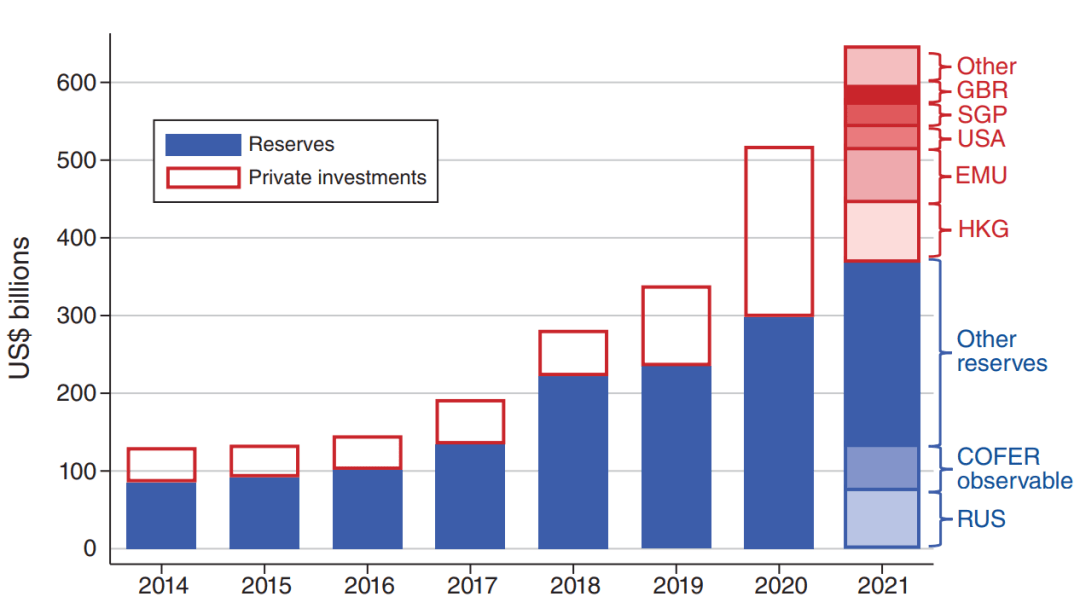 注:本图展示了对境外持有人民币计价债券的构成估算,区分为中央银行储备持有与私人部门持有两部分。储备数据来自国际货币基金组织(IMF)的 COFER 数据库,私人持有数据来自 IMF 的 CPIS 数据库或商业数据来源。