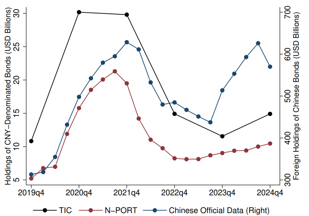 注:图中比较了2019年第四季度至2024年第四季度期间,美国持有的中国人民币计价债券(左轴)与境外投资者持有的中国债务总规模(右轴)。黑线表示基于 TIC 数据的美国总体持仓,红线表示基于 N-PORT 数据的美国共同基金持仓,蓝线表示来自中国官方来源(中国中央国债登记结算有限责任公司 CCDC 与上海清算所 SHCH 通过债券通收集的月度统计)的境外整体持仓。