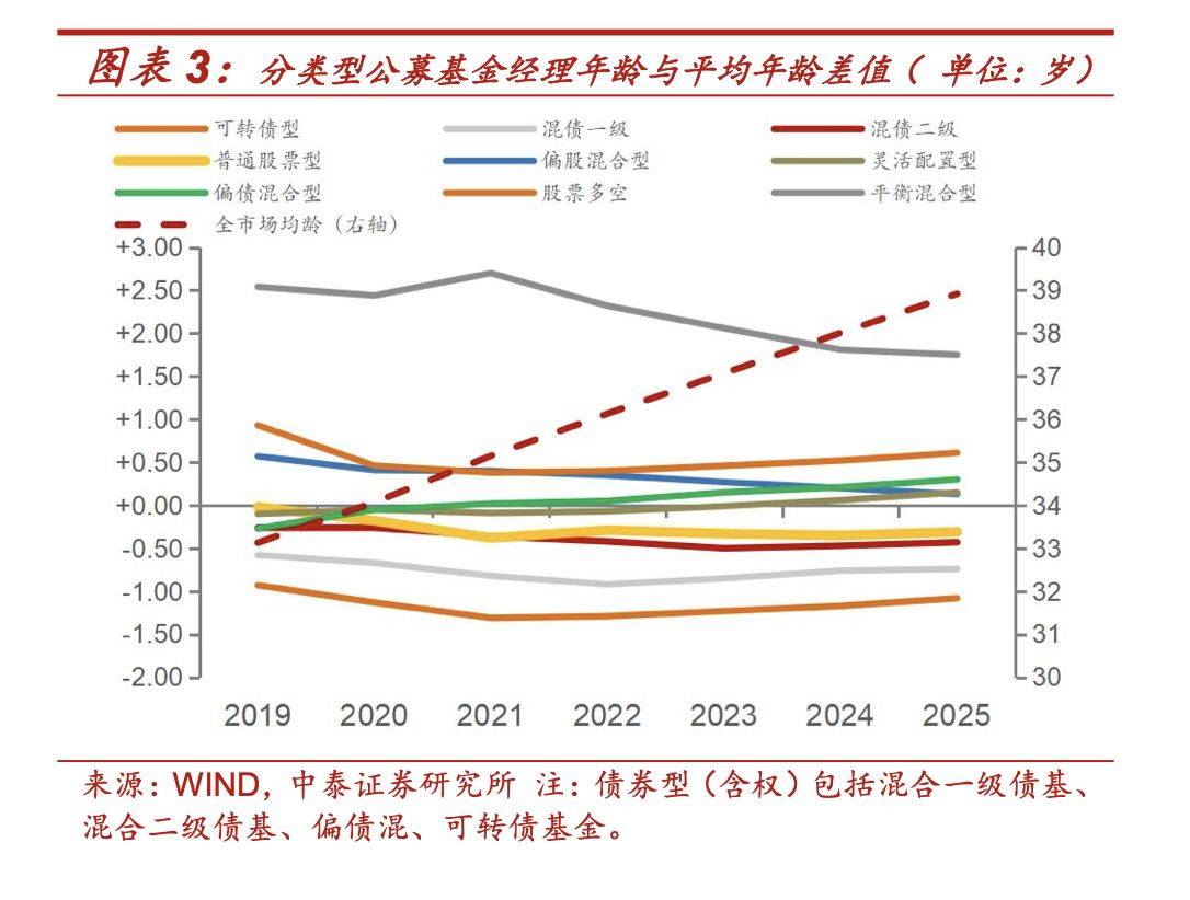 报告以这些基金经理2025年四季度数据为基准,用基金第一大持仓作为基金经理偏好的代理变量,用现任经理的平均年龄作为衡量基金经理年龄的代理变量,行业的“年龄”为第一大重仓股所属行业的持仓市值作为权重,与经理年龄进行加权平均计算。