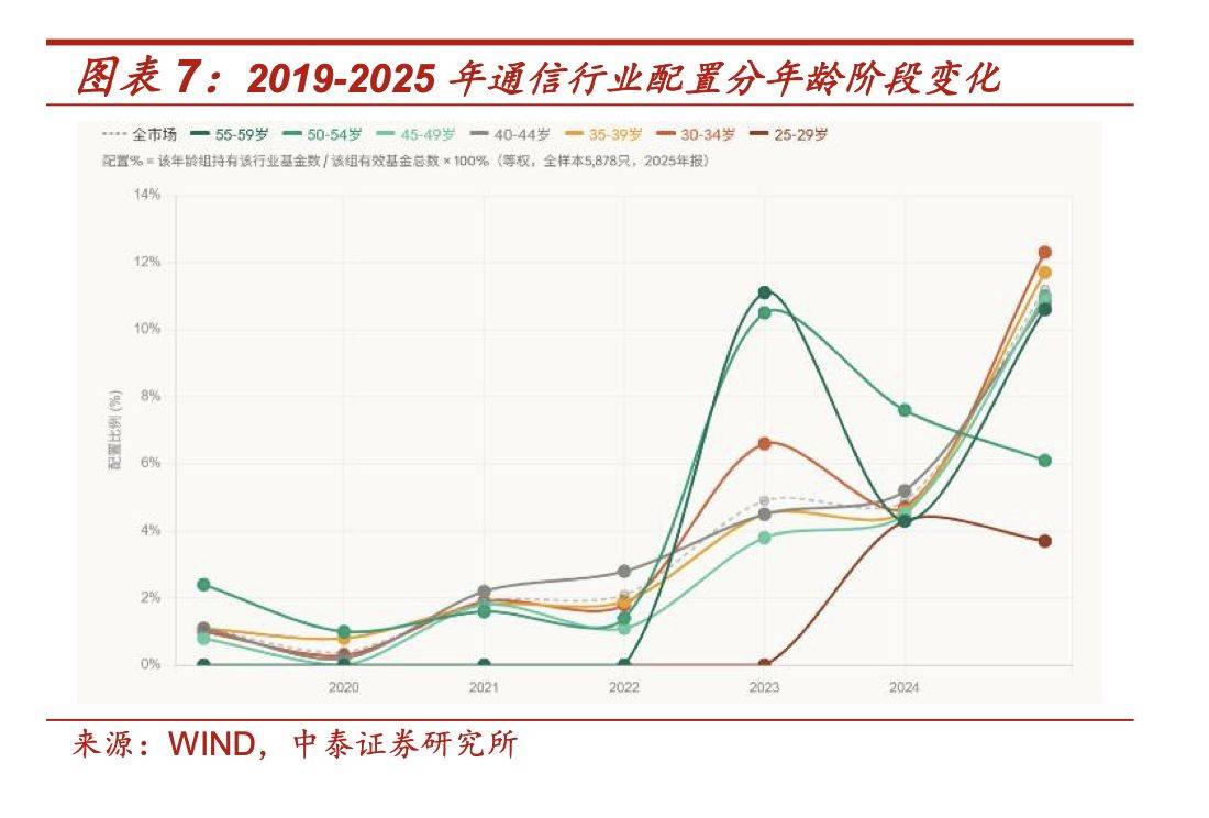 对于通信行业,在2025年获得老中轻三代经理的一致共识,特殊的是年龄层在50-54岁阶段的经理,低配中际旭创,超配立讯精密,在本轮AI产业趋势中更青睐电子领域相关标的。